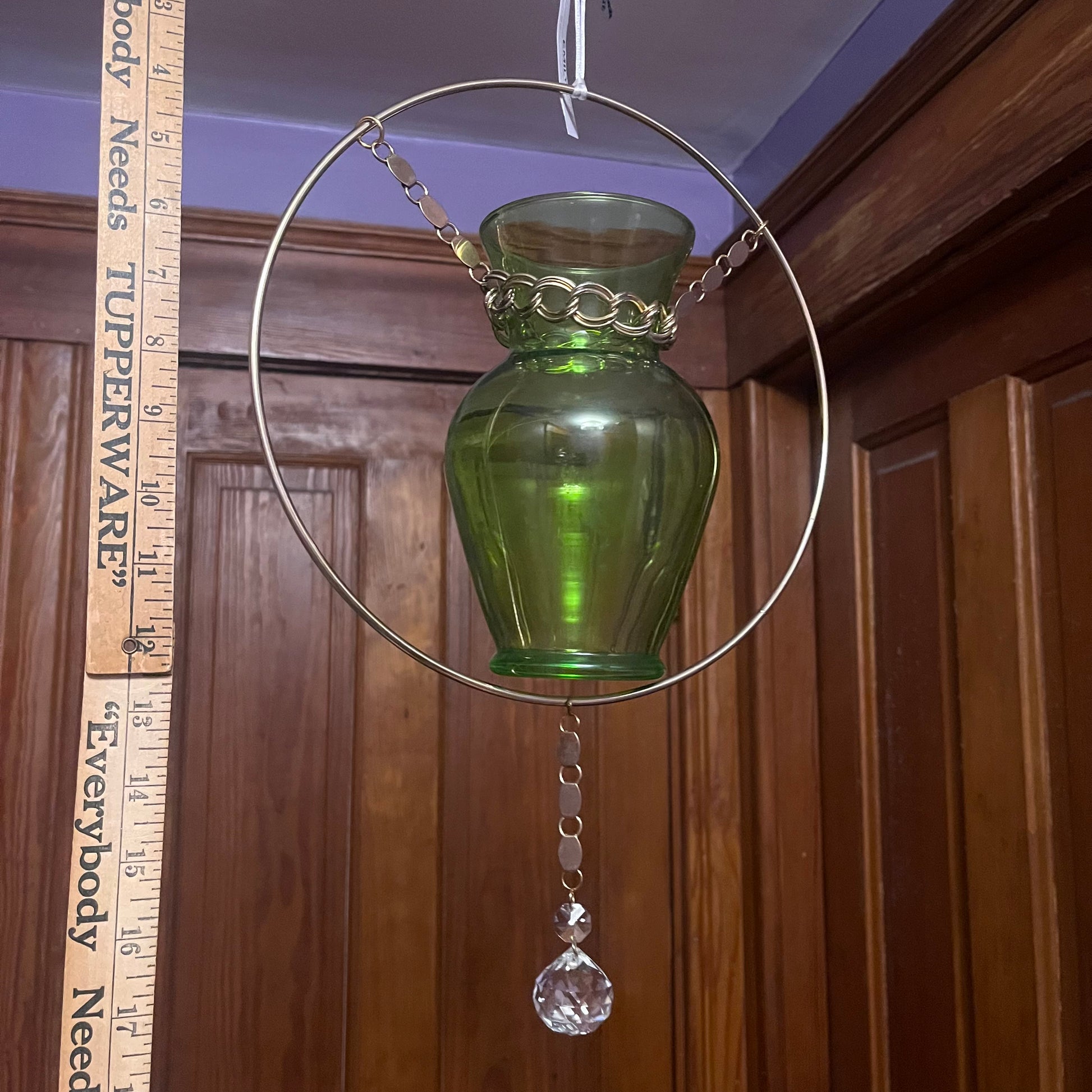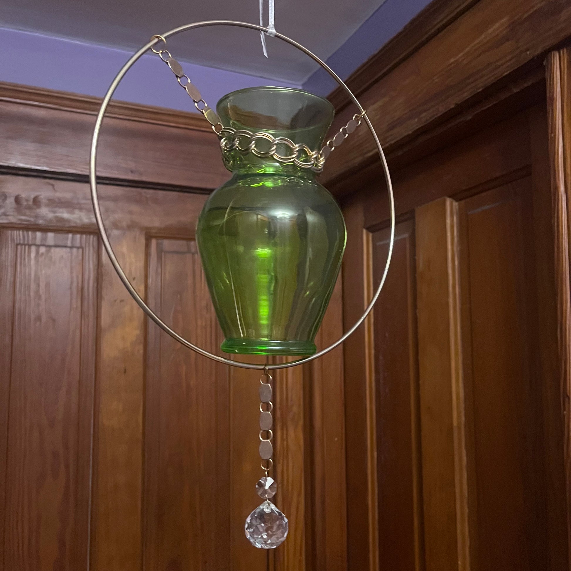 Green vase, chunky vintage chain, and a spherical crystal will give your plant collection a retro vibe while it grows