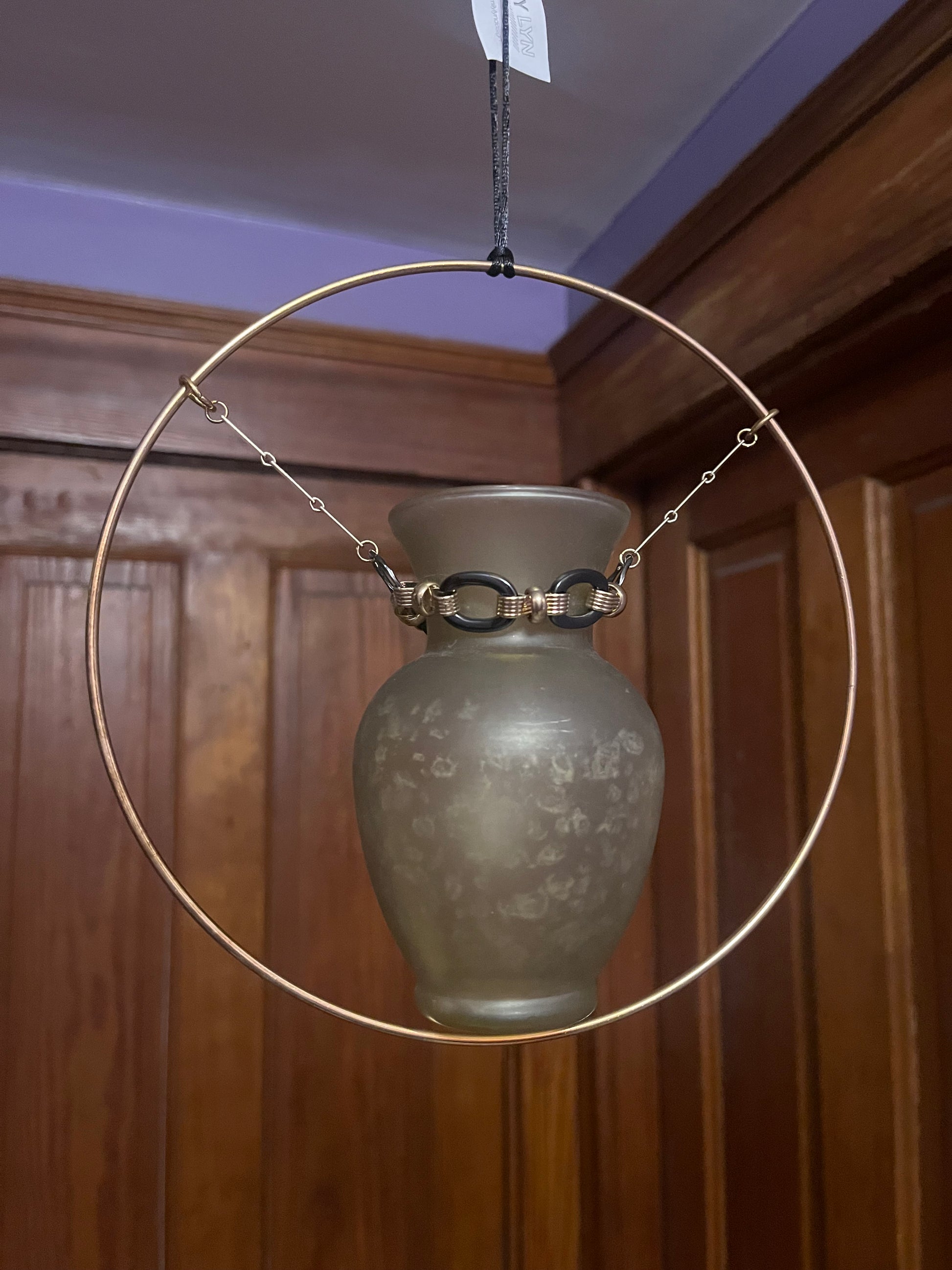 A frosted classic shaped vase with upcycled jewelry pieces will be a lovely addition to your plant collection.
