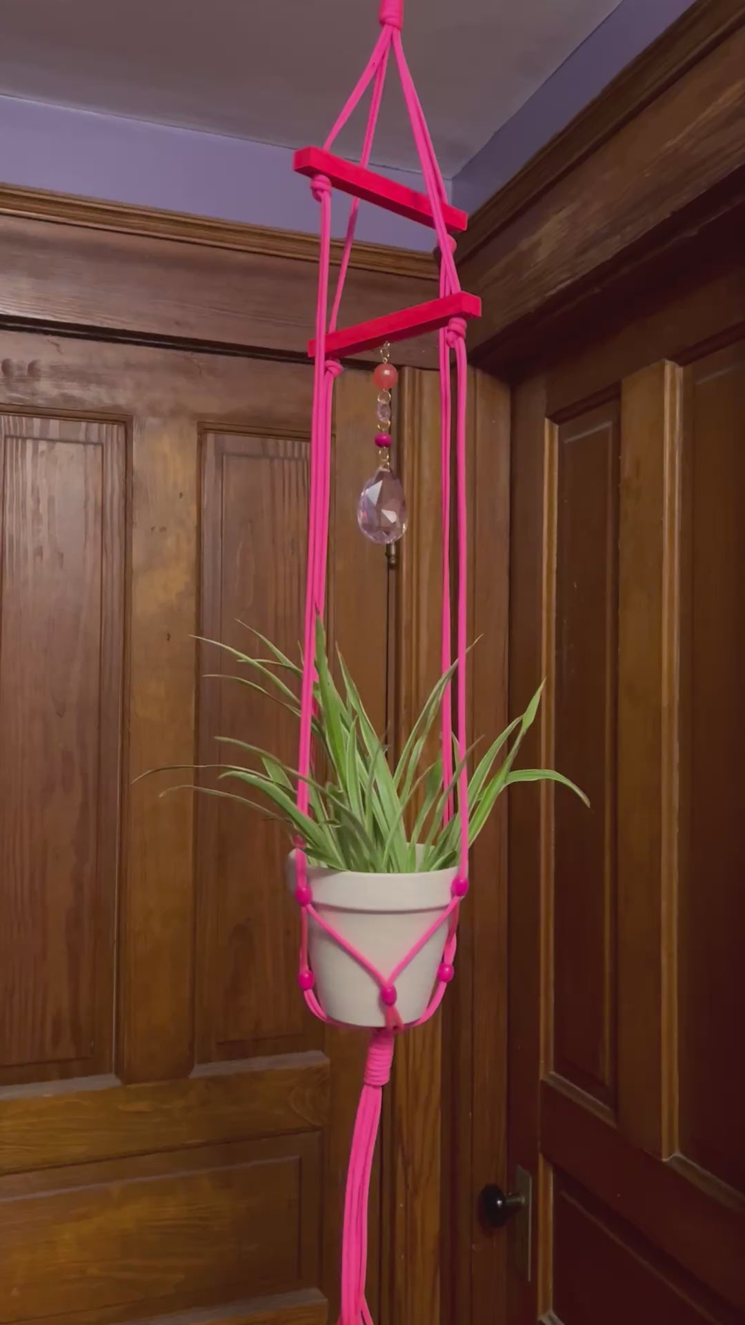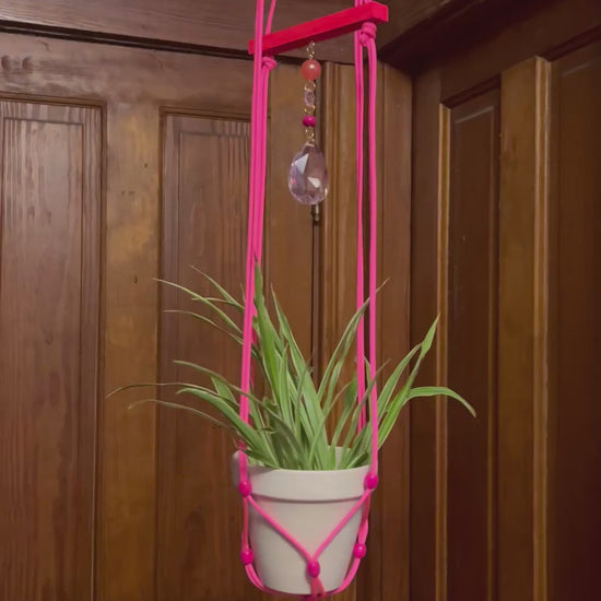 Plant hanger â bright pink rope, 1 pink chandelier crystal with beads drop (both upcycled), painted wood